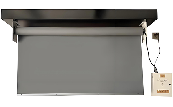 连接电源线和控制线,将定边挡烟垂壁安装在支架上,并用螺丝固定。